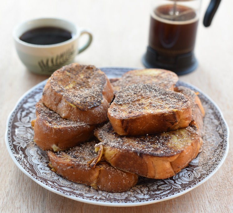 Las torrejas son de origen europeo con versiones que se encuentran en Francia y España y probablemente se remontan a la Edad Media. Usted puede utilizar casi cualquier tipo de pan del día anterior, sin embargo, para las torrejas funciona un pan a base de yema. Me encanta usar brioche o el pan jalá (un pan judío) para esta receta. En El Salvador se utiliza un pan similar que se conoce como torta de yema. Hay un sinnúmero de variaciones de este postre en toda América Latina y no es un postre delicado. Realmente se puede ser creativo y añadir diferentes sabores, mermeladas, jarabes y rellenos. Va muy bien con una buena taza de café o un té.