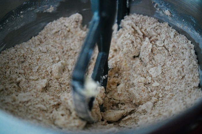 - Combine flour, bran, baking powder, yeast, sugar, salt, and cinnamon in the bowl of a stand mixer fitted with the paddle attachment. Mix on lowest speed to avoid a flour explosion.