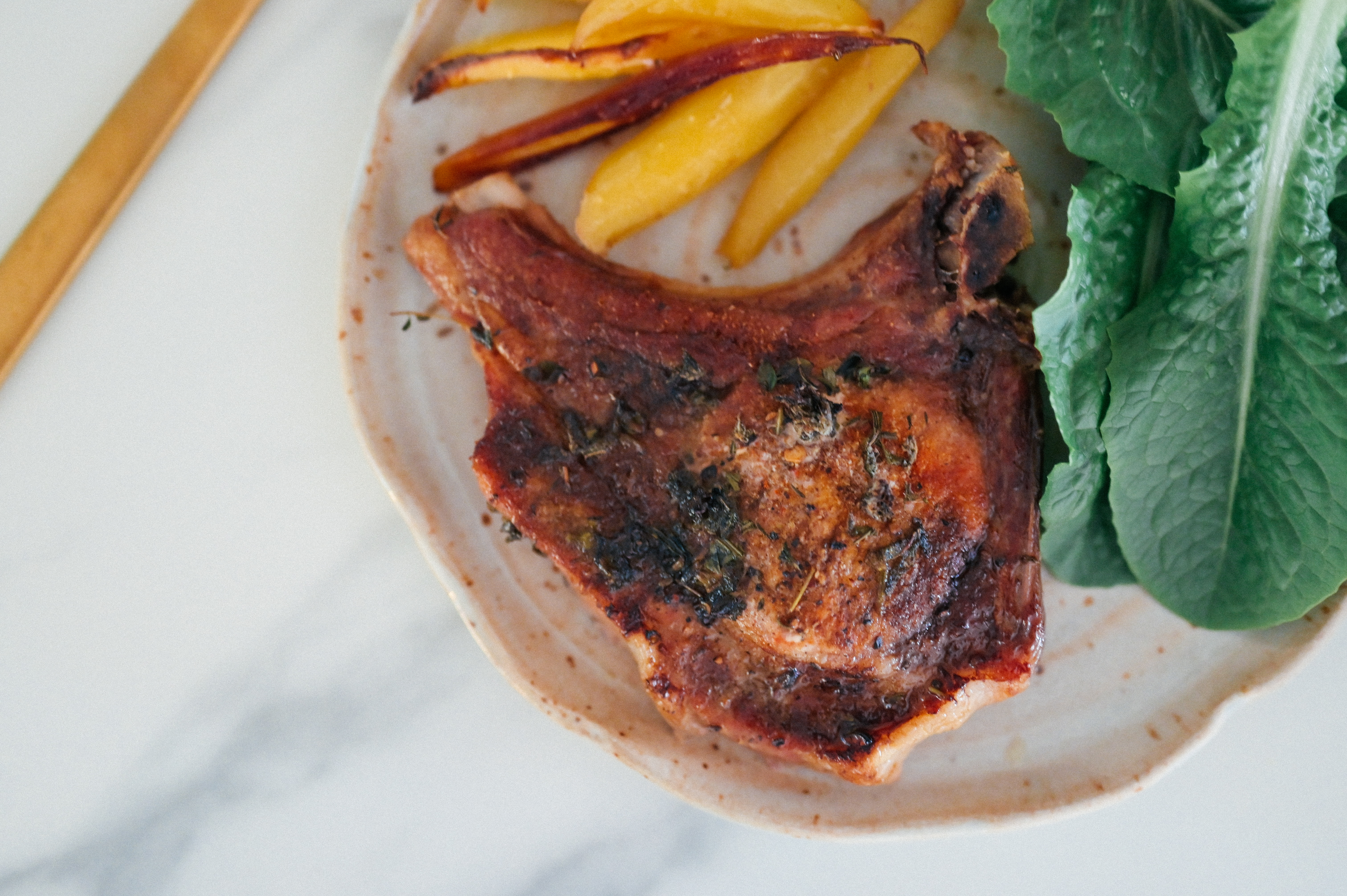 - Rub the pork chops with olive oil and balsamic vinegar and then sprinkle all over with garlic powder, onion powder, paprika, chopped herbs, salt and pepper.