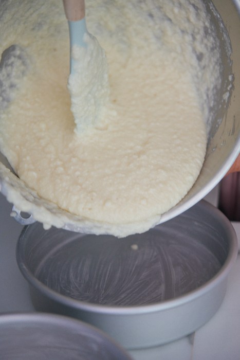 - Add the flour and mix on the lowest speed. Slowly add the milk until you end up with batter similar to pancake batter.