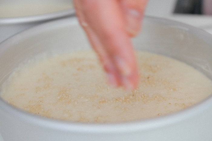 - Pour the batter in greased baking pans or tins and sprinkle with sesame seeds. I used three 7″ pans plus one 6″ pan because that’s what I had on hand. However, you may use any size pan or baking dish as long as you spread out the batter thinly and evenly. Quesadillas are supposed to be roughly 1 inch thin more or less.