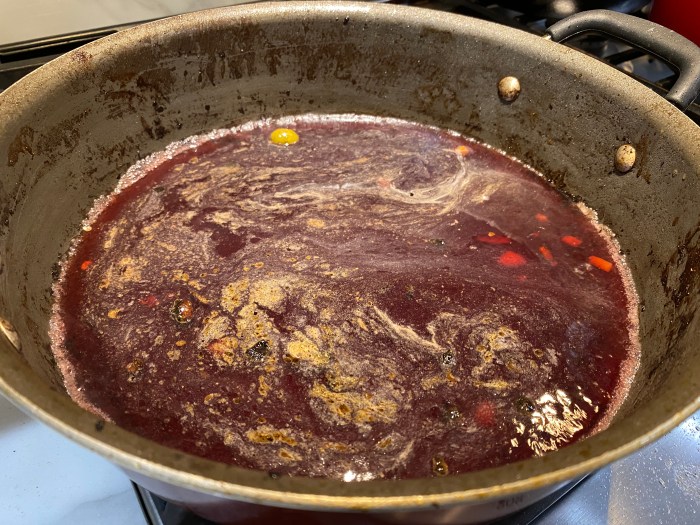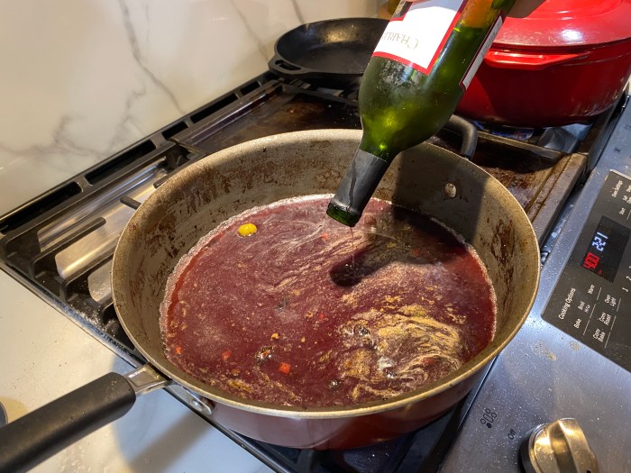- Heat oil in a cast iron skillet or Dutch oven and sear the meat on all sides. Any skillet works, but it is best to use one that can handle high heat. Deglaze the pan with red wine.