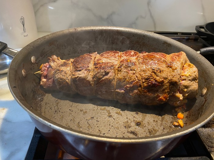 The process begins with cutting the meat open and pounding it thin. Then you stuff it with a meat and vegetable filling, and finally roll it and tie it. It is then roasted in the oven and basted with the traditional tomato sauce, the same type we use for the holiday turkey. It is traditionally served with rice and salad, but any of your favorite sides are just as good. Mashed potatoes and steamed vegetables would go really well with this meat because it is saucy and juicy.